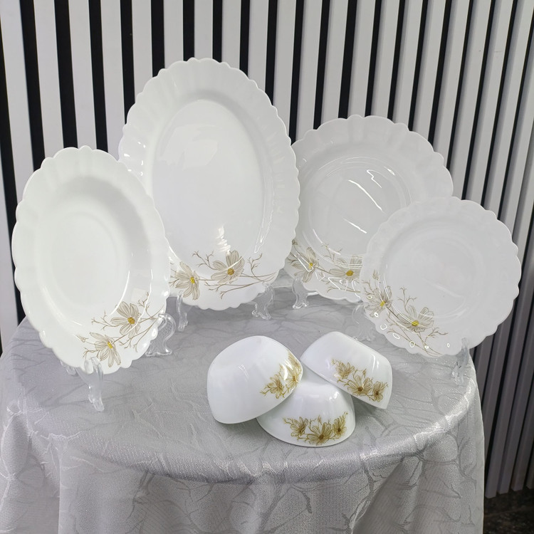 سرویس ۲۵ پارچه قالب کنگره طرحهای جدید، کیفیت و مقاومت مشابه سرویس ۲۶ پارچه دارد، اما کاسه سالاد ندارد.
