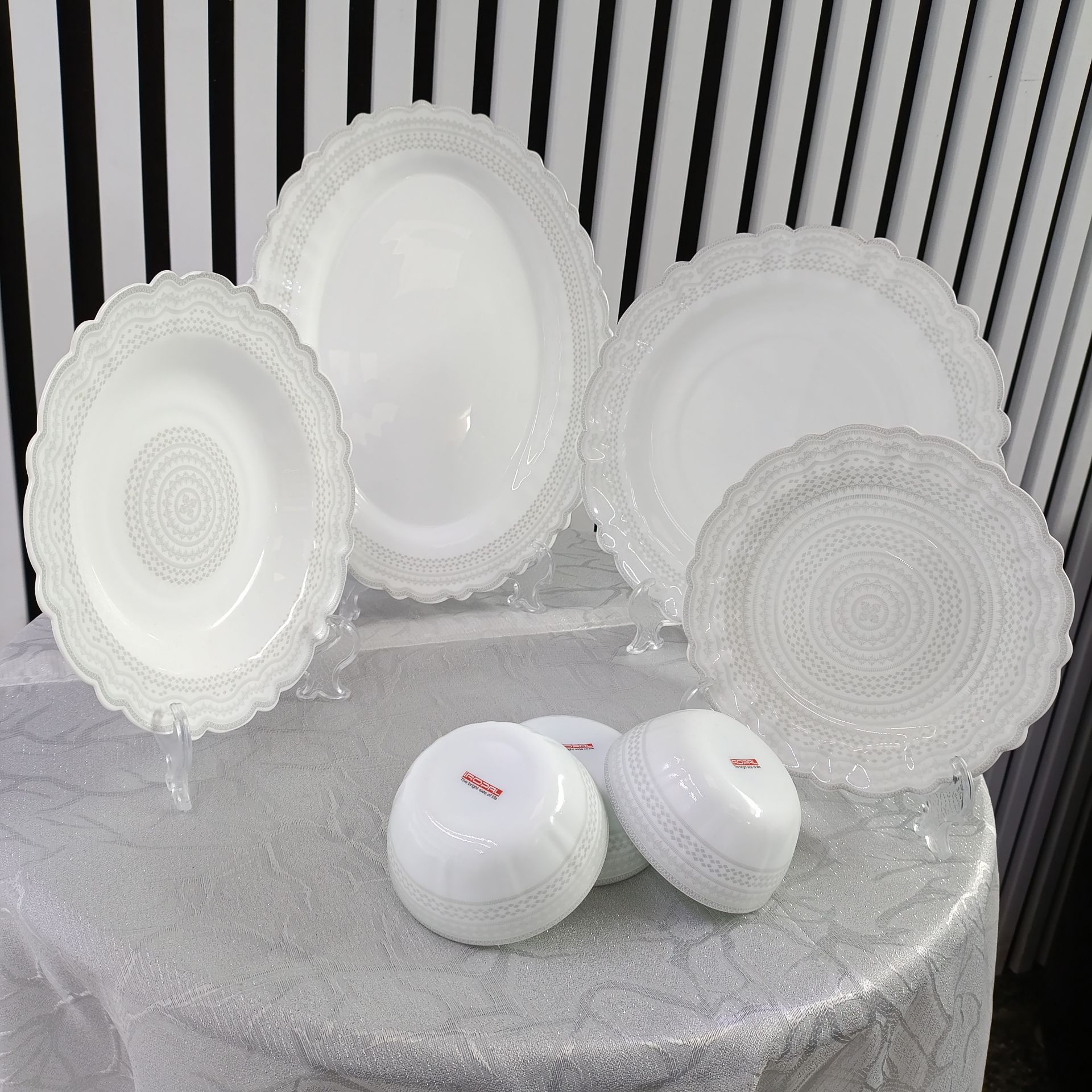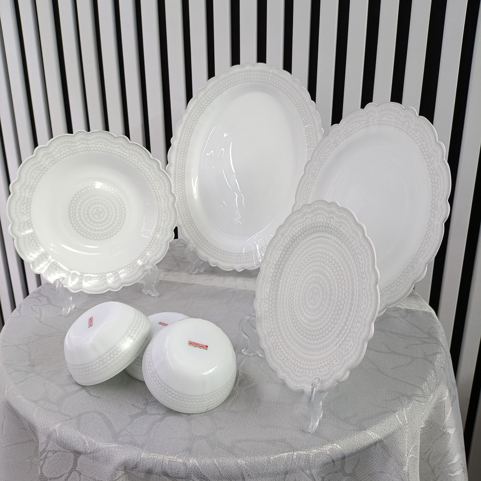 سرویس ۲۵ پارچه قالب کنگره طرحهای جدید، کیفیت و مقاومت مشابه سرویس ۲۶ پارچه دارد، اما کاسه سالاد ندارد.