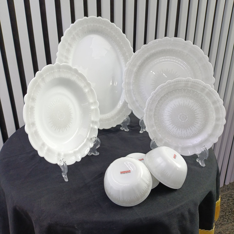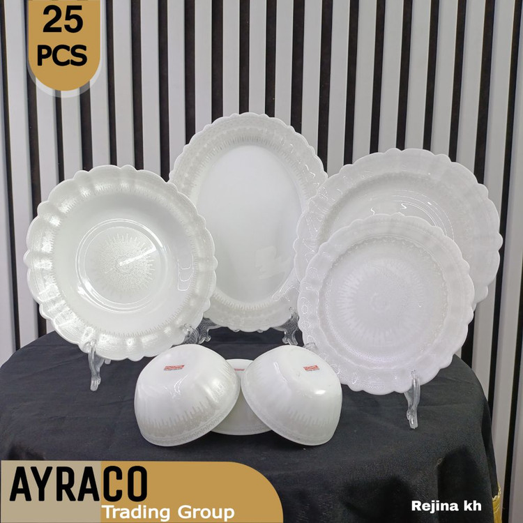سرویس ۲۵ پارچه قالب کنگره طرحهای جدید، کیفیت و مقاومت مشابه سرویس ۲۶ پارچه دارد، اما کاسه سالاد ندارد.