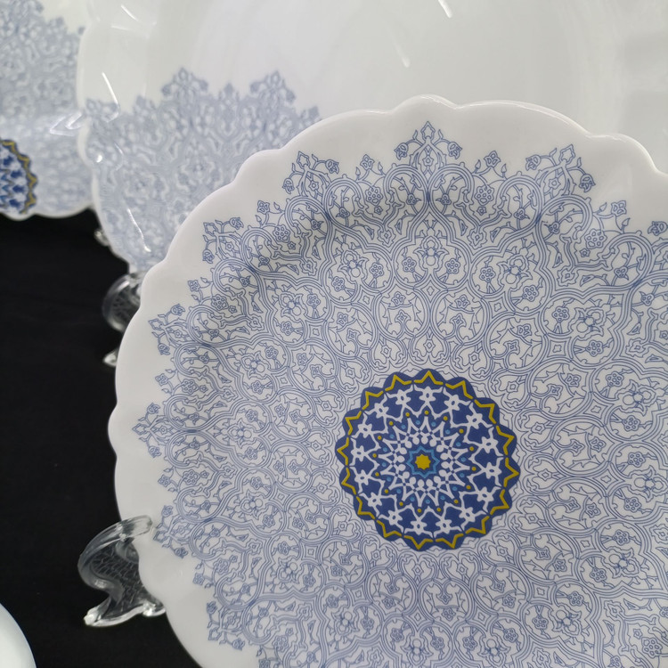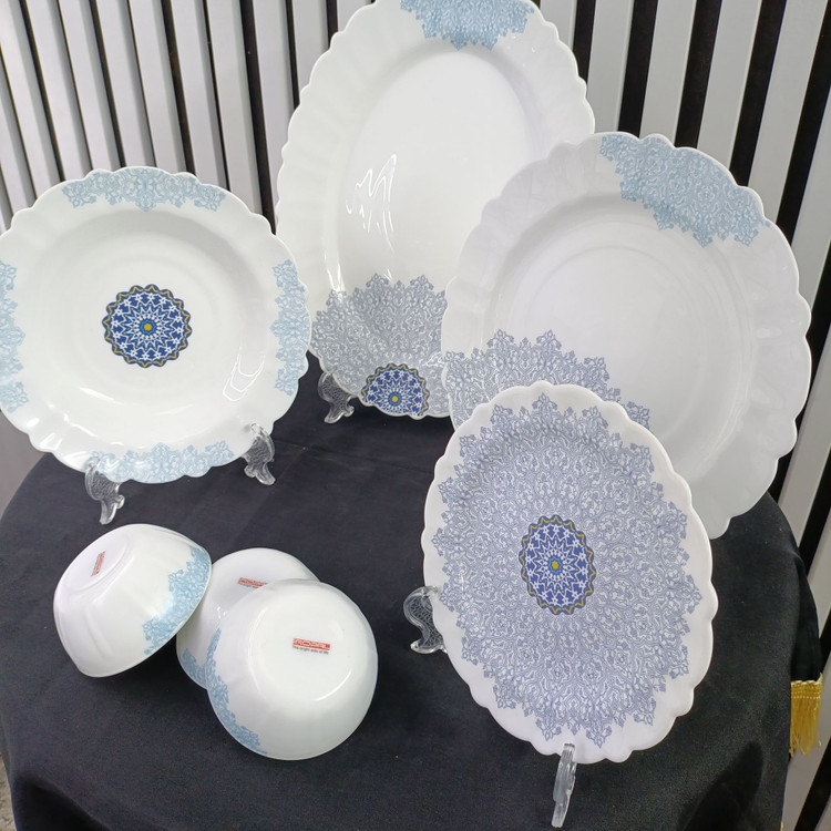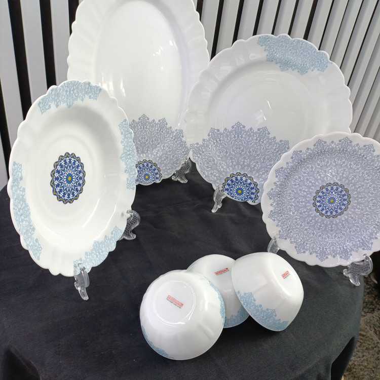 جنس این سرویس از آرکوپال مقاوم (Opal Glass) ساخته شده که علاوه بر شباهت به چینی، سبکتر و بادوامتر بوده و در برابر ضربه و حرارت مقاوم است. طراحی قالب کنگرهای باعث جلوهی ویژه و هماهنگی با انواع ظروف دیگر میشود.