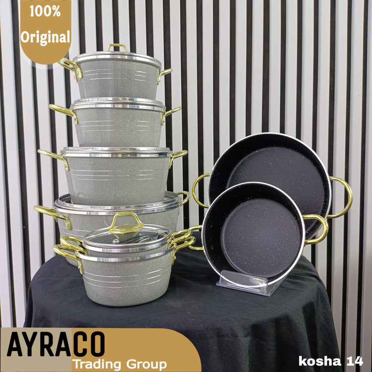 سرویس قابلمه ۱۴ پارچه شمیم کوشا رنگ عدسی– پوشش گرانیت نچسب، دسته طلایی