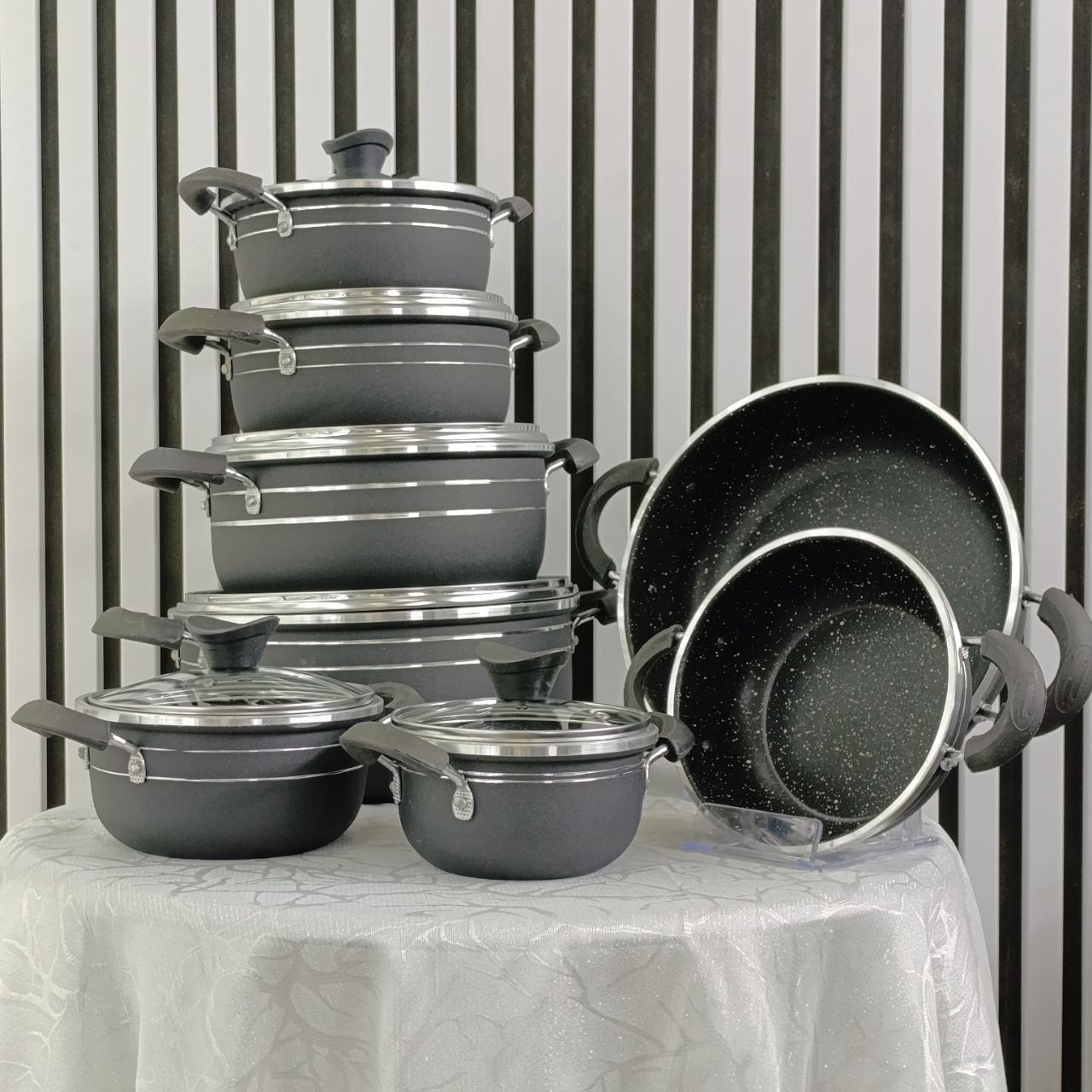 سرویس 14 پارچه پروفا برند زرفام Zarfam انتخابی حرفهای و جذاب برای تامین نیازهای پختوپز در آشپزخانههای مدرن است. این سرویس 14 پارچه با طراحی شیک، رنگ مشکی مات و خطوط مینیمال، علاوه بر کارایی بالا، جلوهای لوکس و حرفهای به فضای آشپزخانه شما میبخشد.