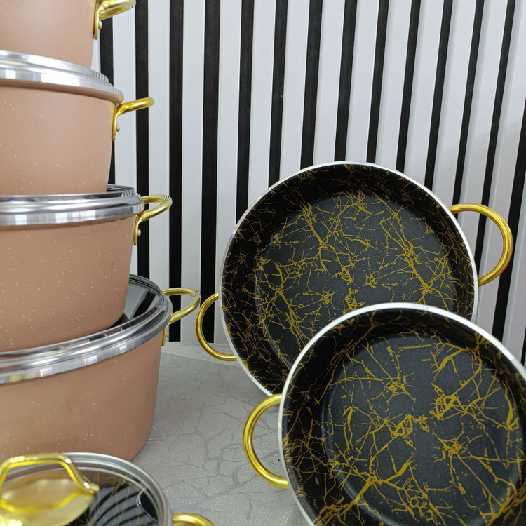 سرویس قابلمه 14 پارچه داخل ماربل زرفام شکلاتی | قابلمههای حرفهای آشپزخانه