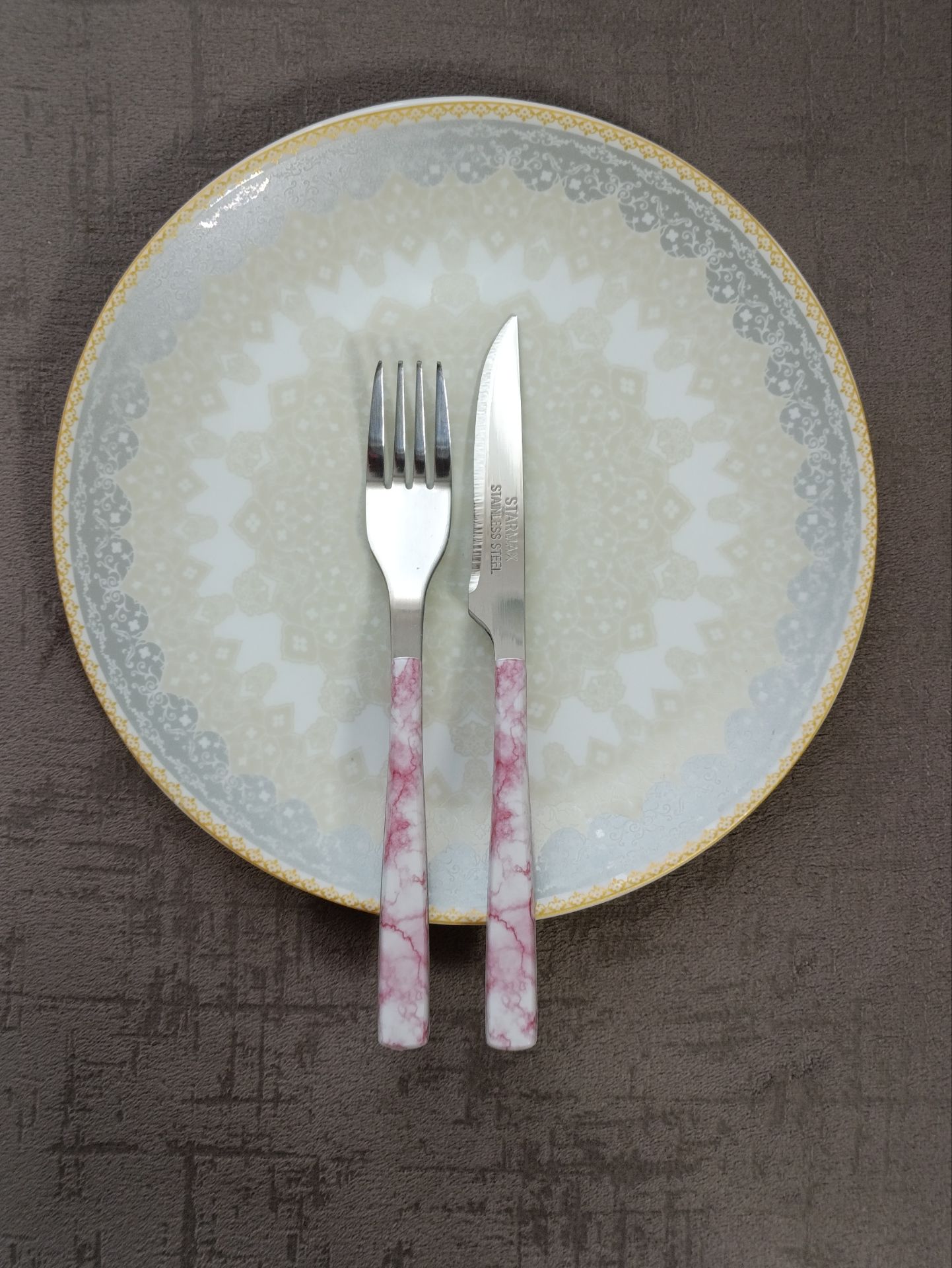کارد و چنگال طرح ماربل کد 207 گزینه ایده آل برای خانواده های شیک و لوکس است این محصول طرح و رنگ مختلف دارد مناسب با هر سلیقه ای است جنس کارد و چنگال از استیل ضدزنگ ساخته شده است.