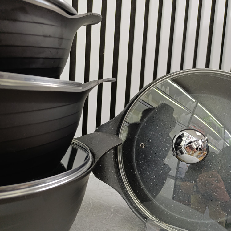پوشش داخلی: سطح داخلی با پوشش نچسب بسیار با کیفیت (مانند گرانیت یا تفلون پیشرفته) پوشیده شده است که مقاومت بالایی در برابر خراشیدگی دارد و از چسبیدن غذا جلوگیری میکند.